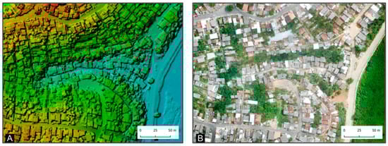 Details on the demography and morphology of slums are also very relevant to understand their vulnerabilities. For example, communities with high population densities and large numbers of people above 60 years old are more vulnerable as compared to lower density areas with less senior inhabitants []. In Figure 10, the spatial variations within the two settlements in terms of built-up density variations are visible. Adding the height information allows us to indicate areas of standing water (sinks), which could be reservoirs of several pathogens and breeding places of vector-borne diseases []. These places are where rainwater will usually accumulate, signalizing flood-prone areas, adding humidity and insalubrity to the interior of the house []. From Figure 9d, it is possible to identify blocks of houses that are less than 2m apart, making their proximity another essential component for virus transmission []. This information may help local health agents to define priority surveillance areas for COVID-19 testing and monitoring when a resident is diagnosed with the disease.