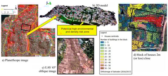 (a) Boundaries of the two selected settlements in Salvador (Brazil) showing a PlanetScope image of 3 m resolution; (b) 3D point cloud-based model; (c) UAV 45° oblique image of a high-risk area due to high built-up density located in a sink; (d) blocks of houses based on their proximity to each other.