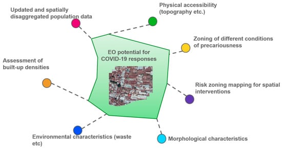 In essence, EO-based data, along with auxiliary spatial information, would bridge data gaps by complementing the spatial dimension and helping to identify the spatial foci for COVID-19 control measurements. Thus, this would allow knowing where vulnerable groups and individuals are, who they are, and how people are exposed. Specifically, the EO-based approach supports the answer to “how people are exposed” by providing spatiotemporal information encoding different aspects of vulnerability. For instance, static information can be derived about the location of groups and individuals, the density of dwelling units and population, the environmental context of households and communities, as well as dynamic information of potential movements, along with road networks, facility accessibility, and relocation and development of households. Most importantly, the EO-based information could be ensured by timely access and used for either post-pandemic management or future risk preparedness. In summary, the study case has shown and/or discussed that EO-based approaches could support: