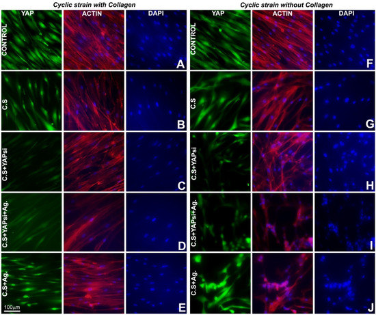 YAP1 localization and cytoskeletal staining during cyclic strain in PDL cells. (A–J) Representative immunofluorescence images for YAP1 localization and actin distribution following cyclic mechanical strain on PDL cells grown on collagen-coated plates (B–E) and without collagen (G–J) under indicated treatment conditions. (A,F) PDL cells grown with or without collagen and not subjected to any mechanical cyclic strain served as controls. Actin was detected using Alexa Fluor 594 Phalloidin (Red) and is presented in a merged form together with cell nuclei counterstained with DAPI (blue). YAP1 was detected using Alexa Fluor 488 (green). Note the distinctive nuclear localization for YAP1 upon cyclic strain in PDL cells grow on collagen-coated surface (B) and to a lesser extent in cells without collagen (G).