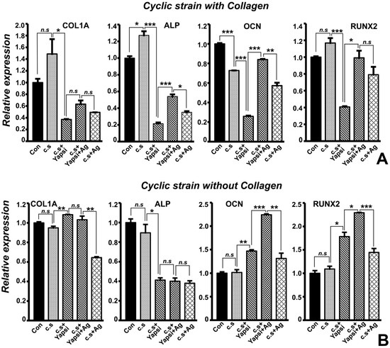 Gene expression analysis for select mineralization and differentiation markers in PDL cells subjected to cyclic strain and controls. Representative RT-qPCR analysis of expression levels for COL1A, ALP, OCN, and RUNX2 in PDL cells grown with collagen (A) and without collagen (B). Transcript levels for each gene were normalized to β-actin transcript levels. Data are presented as fold difference of expression levels for each experimental treatment condition when compared to cells not subjected to any mechanical strain (Con). Graphs are representative of three independent PCR analysis obtained from at least three experiments for each treatment condition. Addition of agrin rescued ALP, OCN, and RUNX2 transcript levels specifically for PDL cells grown on collagen-coated surfaces (A). Con—control; c.s—cyclic strain; Yapsi—YAP1 siRNA treatment; Ag—agrin. t test for statistical level of significance; *, p < 0.05; **, p < 0.01; ***, p < 0.005. n.s—not significant.