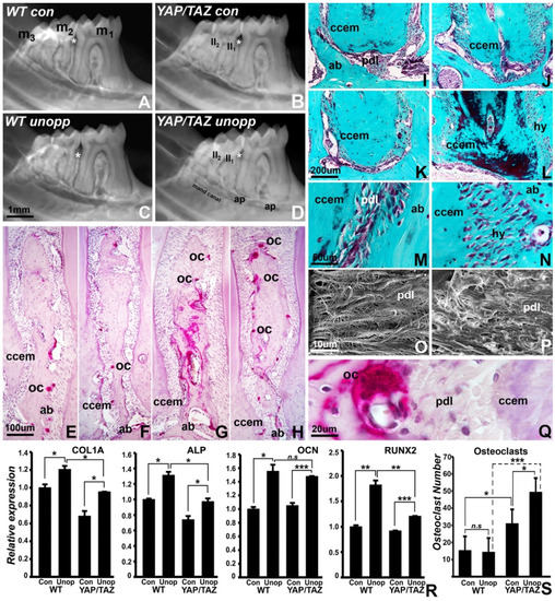 To ask the question of whether unloading-related tissue remodeling is uniquely affected by the loss of YAP/TAZ, wild type and Wnt1Cre/YAP/TAZ mice were subjected to unopposed molar model exposure and compared to controls positioned in physiological occlusion. Radiographic comparisons demonstrated that in YAP/TAZ mutant mice, the alveolar bone between the first and second molar had lost periodontal ligament boundaries and contours while the roots of the second molar and the surrounding bone and ligament formed an amorphous electron dense mass without clear separations (Figure 4A–D). There was a similar loss of cementum/bone separations at the apices of the first molar roots (Figure 4A–D). Explaining the diffusion of bone/cementum outlines in mutant mice, there was a substantial increase in osteoclast numbers on paraffin tissue sections, with both the control and the unopposed molar group of the Wnt1Cre/YAP/TAZ mutant group revealing a significant 2-fold and 3-fold increase in osteoclast numbers, respectively (Figure 4E–H,Q,S). Gomori’s connective tissue stain identified areas of periodontal ligament hyalinization and greatly increased periodontal fiber thickness in Wnt1Cre/YAP/TAZ mutant mice (Figure 4I–P). To correlate morphological observations with changes in mineralization-related gene expression, expression levels between control and unopposed mouse mandibles from both wild type and Wnt1Cre/YAP/TAZ mice were compared. There was a significant increase in transcript levels for COL1A, ALP, OCN, and RUNX2 in the unopposed molar model when compared to the corresponding controls for both wild type and Wnt1Cre/YAP/TAZ mice (Figure 4R). ALP and RUNX2 in the unopposed state were upregulated to a lesser degree in the Wnt1Cre/YAP/TAZ group (1.25-fold upregulated for ALP, 1.3-fold upregulated for RUNX2) when compared to the wild type (1.35-fold upregulated for ALP, 1.8-fold upregulated for RUNX2) (Figure 4R, ALP and RUNX2 graphs). Confirming our data from Figure 1, COL1A transcript levels were 0.7-fold downregulated in Wnt1Cre/YAP/TAZ mice, and the unopposed molar state resulted in a significantly elevated expression of COL1A among wild type (1.2-fold) and Wnt1Cre/YAP/TAZ (1.28-fold) mice (Figure 4R). OCN transcript levels were upregulated 1.5-fold upon unloading in Wnt1Cre/YAP/TAZ mice both in control and unopposed molar groups (Figure 4R). In addition, comparison of gene expression levels between wild type and Wnt1Cre/YAP/TAZ unopposed samples revealed a significant level of downregulation for COL1A (1.3-fold), ALP (1.3-fold), and RUNX2 (1.5-fold) transcript levels in Wnt1Cre/YAP/TAZ mice. The reduced expression levels of mineralization-associated genes in Wnt1Cre/YAP/TAZ mice in controls and unloaded conditions further explain the resorptive state of YAP/TAZ mutant mice in unloaded dentoalveolar complexes.