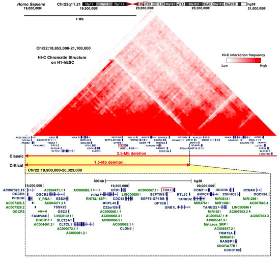 Proximal deletions of chromosome 22q11.2 are responsible for the clinical features of DGS/VCFS. Snapshot of the UCSC Genome Browser (http://genome.ucsc.edu accessed on 3 August 2021) in the hg38 assembly showing the genomic context in the proximal deletions of chromosome 22q11.2. Top, the 25 kb resolution Hi-C data in H1 human embryonic stem cell line (H1-hESC). Bottom, the coding (blue) and noncoding RNAs (green), including miRNAs and long noncoding RNAs, are shown.