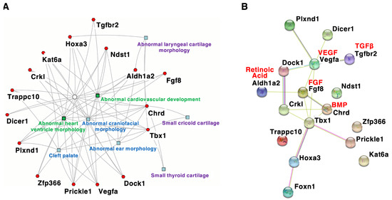 Interaction network of genes associated with DGS/VCFS phenotypes in mice. (A) A gene-based network where each gene connects to a feature. The network was constructed using ToppCluster (https://toppcluster.cchmc.org/ accessed on 6 May 2022). Mouse phenotypes are shown in the network. (B) The protein–protein interaction network was constructed using the STRING tool (https://string-db.org/ accessed on 6 May 2022). Genes associated with DGS/VCFS phenotypes in mice (Table 4) were the input. Different colors represent different types of evidence of a connection between proteins.