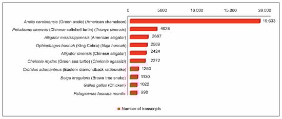 The assembled transcripts were matched, with Chordata protein from UniProt database, using the BLASTX program. A total of 89,899 transcripts were obtained, out of which 55,344 transcripts could find a homolog from the UniProt database. Transcripts that could establish homology relationship, with E-value ≤ 10−5 and similarity score ≥ 40%, were retained in the annotation pipeline for further annotation while the others remain un-annotated. Overall, we found that 53,201 of the assembled transcripts had at least one significant hit in the UniProt Chordata database, whereas 34,555 transcripts did not show a significant hit. In this analysis using BLASTX, around 60% of the transcripts could identify a homolog with a minimum E value confidence of 1 ×10−5. This indicates the high level of conservation of the proteins. Around 81% of the transcripts could identify a homolog with more than 60% similarity at the protein level with the existing proteins. The distribution of similarity scores from BLASTX results is shown in Figure 1. The top BLASTX hit of each transcript was studied and the organism’s name was extracted. Among the annotated UniGenes, 19,633 transcripts received the top hit with Anolis carolinensis (green anole lizard), followed by other reptiles. The ten most frequently appearing organisms among the source organisms of the homologs are shown in Figure 2.