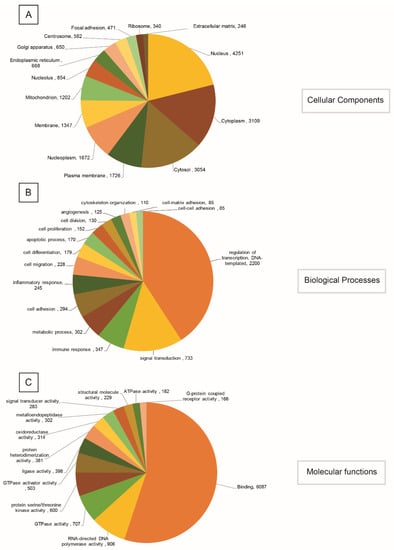 For BP, the majority of the transcripts were found to be from the regulation of transcription (GO:0006355, 2200) and signal transduction (GO:0007165, 733) (Figure 3A). In the case of MF, 8275 of the transcripts belonged to the nucleic acid binding category (GO:0003676), including its child terms like DNA binding (GO:0003677), RNA binding (GO:0003723) and transcription factor activity (GO:0003700) (Figure 3B). Figure 3C shows that most of the assignments were given to transcripts from the integral component (GO:0016021, 7593) followed by the nucleus (GO:0005634, 4251) (Figure 3C).