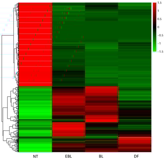 Heat map of differentially expressed transcripts across all the stages (NT: Normal Tail; EBL: Early Blastema; BL: Blastema; DF: Differentiation) of regeneration in H. flaviviridis. In the heat map, for normal tail, black bands represent the basal level of expression. The gradient of green and red represents the extent of downregulation or upregulation, respectively, compared to the housekeeping gene. However, for EBL, BL and DF the black, green and red represent basal, and extent of downregulation or upregulation, respectively, compared to normal tail.