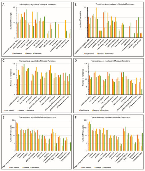 Histogram representation of the gene ontology classification of up- and down-regulated transcripts from early blastema (EBL), blastema (BL) and differentiation (DF) stages with respect to the normal tail during regeneration in H. flaviviridis. (A,B) Up-regulated and down-regulated transcripts in biological processes; (C,D) Up-regulated and down-regulated transcripts in molecular processes; (E,F) Up-regulated and down-regulated transcripts in cellular processes.