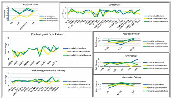 From the heatmap of differentially expressed genes (DEGs), genes that showed significant changes across all the stages of regeneration were identified. Most of these genes were found to be part of biological processes and signaling pathways. A set of pathways was analyzed thoroughly to understand the level of gene expression regulation in the tissues at all stages of regeneration. Primarily, genes from processes such as angiogenesis, apoptosis and inflammation were reported in this study (Figure 6). Genes from cell signaling pathways such as Shh, FGF, TGF and Wnt were also analyzed. About 85 genes were up-regulated and 145 others were down-regulated at all stages. The expression levels of genes in these pathways are shown in Figure 6.