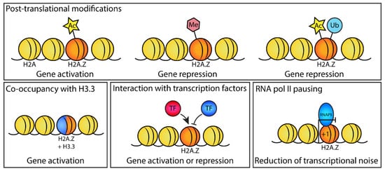 - Mylonas, C.; Lee, C.; Auld, A.L.; Cisse, I.I.; Boyer, L.A. A dual role for H2A.Z.1 in modulating the dynamics of RNA polymerase II initiation and elongation. Nat. Struct. Mol. Biol. 2021, 28, 435–442. [Google Scholar] [CrossRef]