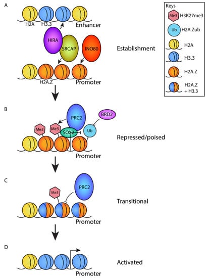 - Hu, G.; Cui, K.; Northrup, D.; Liu, C.; Wang, C.; Tang, Q.; Ge, K.; Levens, D.; Crane-Robinson, C.; Zhao, K. H2A.Z facilitates access of active and repressive complexes to chromatin in embryonic stem cell self-renewal and differentiation. Cell Stem Cell 2013, 12, 180–192. [Google Scholar] [CrossRef] [PubMed]