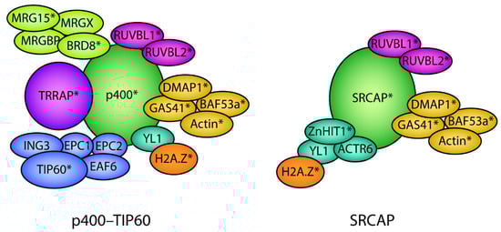 - Ruhl, D.D.; Jin, J.; Cai, Y.; Swanson, S.; Florens, L.; Washburn, M.P.; Conaway, R.C.; Conaway, J.W.; Chrivia, J.C. Purification of a human SRCAP complex that remodels chromatin by incorporating the histone variant H2A.Z into nucleosomes. Biochemistry 2006, 45, 5671–5677. [Google Scholar] [CrossRef]