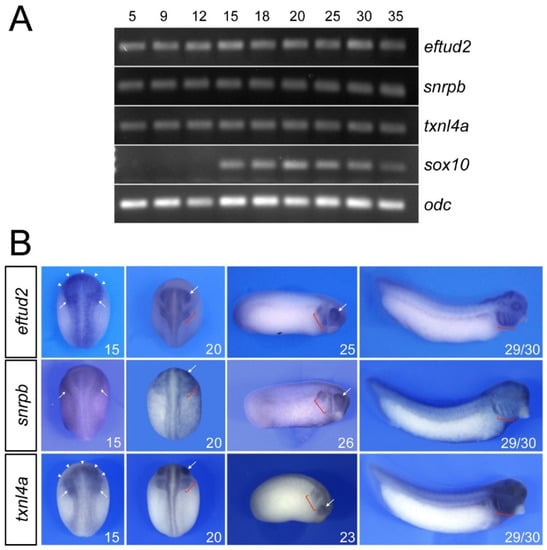 Developmental expression of eftud2, snrpb and txnl4a. (A) RT-PCR analysis indicates that eftud2, snrpb and txnl4a are expressed at all stages examined whereas sox10 is first activated at stage 15. odc is shown as a loading control. (B) At stage 15, eftud2 and txnl4a transcripts are enriched at the anterior neural plate (arrowheads) and the neural-crest-forming regions (arrows), whereas snrpb appears to be ubiquitously expressed. At stages 20 to 26, the three genes are enriched in the pharyngeal arches (brackets) and the eyes (arrows). At stage 29/30, the expression of eftud2, snrpb and txnl4a is maintained in the pharyngeal arches (brackets). Stages 15 and 20 are dorsal views, anterior to top. Stages 23, 25, 26 and 29/30 are lateral views, dorsal to top, anterior to right.