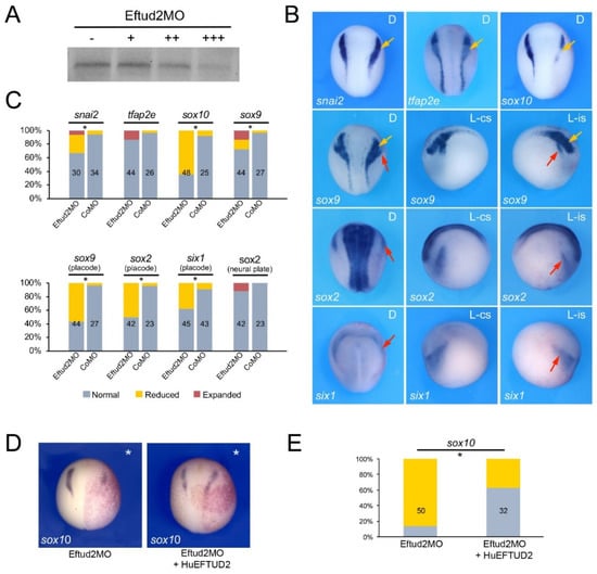 Eftud2 knockdown affects neural crest formation. (A) Increasing amounts of Eftud2MO, 10 ng (+), 100 ng (++) and 500 ng (+++), block translation directed by eftud2 mRNA. (-) Translation without Eftud2MO (B) Phenotype of Eftud2MO-injected embryos (30 ng) on neural crest (yellow arrows) and placode (red arrows) gene expression at stage 15. The gene analyzed in each panel is indicated in the lower left corner. D indicates dorsal view, anterior to top. L-cs indicates lateral view control side, anterior to left. L-is indicates lateral view injected side, anterior to right. (C) Quantification of the phenotypes. The numbers in each bar indicate the number of embryos analyzed. (D) sox10 expression in Eftud2MO-injected embryos is partially restored by expression of HuEFTUD2 resistant to the MO. The injected side is indicated by an asterisk. Dorsal views, anterior to top. (E) Quantification of the results. The numbers in each bar indicate the number of embryos analyzed. Statistically significant differences are indicated (*) p-value < 0.05 (Chi-squared test).