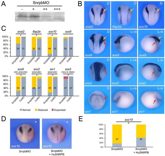 Snrpb knockdown affects neural crest formation. (A) Increasing amounts of SnrpbMO, 10 ng (+), 100 ng (++) and 500 ng (+++), block translation directed by snrpb mRNA. (-) Translation without SnrpbMO (B) Phenotype of SnrpbMO-injected embryos (5 ng) on neural crest (yellow arrows) and placode (red arrows) gene expression at stage 15. The gene analyzed in each panel is indicated in the lower left corner. D indicates dorsal view, anterior to top. L-cs indicates lateral view control side, anterior to left. L-is indicates lateral view injected side, anterior to right. (C) Quantification of the phenotypes. The numbers in each bar indicate the number of embryos analyzed. (D) sox10 expression in SnrpbMO-injected embryos is partially restored by expression of HuSNRPB resistant to the MO. The injected side is indicated by an asterisk. Dorsal views, anterior to top. (E) Quantification of the results. The numbers in each bar indicate the number of embryos analyzed. Statistically significant differences are indicated (*) p-value < 0.05 (Chi-squared test).