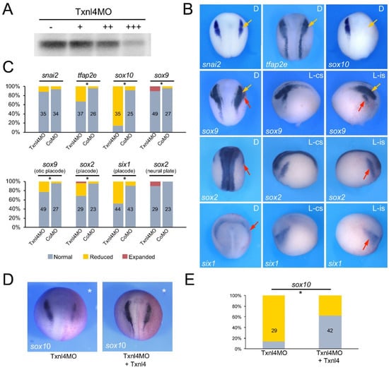 Txnl4a knockdown affects neural crest formation. (A) Increasing amounts of Txnl4MO, 10 ng (+), 100 ng (++) and 500 ng (+++), block translation directed by txnl4a mRNA. (-) Translation without Txnl4MO. (B) Phenotype of Txnl4MO-injected embryos (30 ng) on neural crest (yellow arrows) and placode (red arrows) gene expression at stage 15. The gene analyzed in each panel is indicated in the lower left corner. D indicates dorsal view, anterior to top. L-cs indicates lateral view control side, anterior to left. L-is indicates lateral view injected side, anterior to right. (C) Quantification of the phenotypes. The numbers in each bar indicate the number of embryos analyzed. (D) sox10 expression in Txnl4MO-injected embryos is partially restored by expression of Xenopus Txnl4 resistant to the MO. The injected side is indicated by an asterisk. Dorsal views, anterior to top. (E) Quantification of the results. The numbers in each bar indicate the number of embryos analyzed. Statistically significant differences are indicated (*) p-value < 0.05 (Chi-squared test).