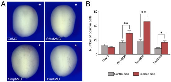 3.2. Eftud2, Snrpb and Txnl4a Knockdown Affect Neural Crest Formation