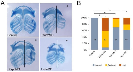 3.4. Eftud2, Snrpb and Txnl4a Knockdown Affect Craniofacial Development