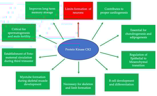 During development, the phosphorylation and dephosphorylation of proteins is essential for the proper formation of organisms [1,2,3]. This process is catalyzed primarily by enzymes that function as kinases, phosphatases, or both [4,5]. Currently, over 530 protein kinases have been identified in humans, many of them involved in embryonic and developmental processes [6,7,8,9]. One of the proteins, protein kinase CK2 (CK2), formerly known as casein kinase II, regulates many of these processes and is expressed during embryogenesis and adulthood [10,11]. CK2 is a holoenzyme consisting of two catalytic subunits (two CK2α, CK2α’, or one CK2α and one CK2α’) and two regulatory beta subunits (CK2β) [12,13,14]. This kinase has over 200 substrates and targets more than 280 phosphorylation sites, indicating its ubiquitous expression and involvement in many cell signaling pathways and molecular processes [10]. It is present in every eukaryotic cell and has been highly conserved throughout evolution. CK2 regulates developmental pathways such as neurogenesis and cardiogenesis, as well as processes in adulthood such as chondrogenesis, osteogenesis, and adipogenesis [15,16,17,18,19,20,21,22]. Further, CK2 is implicated in the progression of diseases including cancer, Alzheimer’s disease, senescence, diabetes, obesity, infectious disease, and cardiovascular diseases [23,24,25]. Due to the vast involvement of CK2 in embryogenesis, development, adulthood, and disease progression, this review aims to summarize the current understanding of this enzyme.