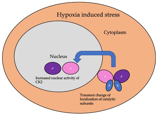The subcellular localization of CK2 determines its regulation, which predominantly includes the cytoplasm, plasma membrane, and nucleus. Interactor proteins and substrates of CK2 are located predominantly in these three cellular compartments [140]. The localization of CK2 varies during cell cycle progression and is sensitive to external stimuli, such as radiation, hypoxia, and stress. Exposure to ionizing radiation (IR) was identified to alter CK2α subunit localization from the cytoplasm to the nucleus in human non-small cell lung cancer cell lines, including H460, A549, and PC9 (Figure 3). The nuclear localization is reported to be transient. In addition, there is an increase in the kinase activity of CK2 during the S phase when cells are exposed to IR. Furthermore, with the pharmacological inhibition of CK2, there is an increase in IR sensitivity [141,142]. This emphasizes the role of CK2 in transmitting radiation stimuli to the nucleus and its involvement in the DNA damage response. Similarly, in M059K human glioma cells, it colocalizes with the IR-induced DNA damage sites [108]. Resistance to IR treatment could be attributed to the dynamic localization of this kinase. During hypoxia, CK2 activity is seen to increase without an increase in its expression, but rather by the transport of catalytic α and α’ subunits to the nucleus (Figure 4). CK2 also plays a role in activating a histone-modifying enzyme, histone deacetylase 2 (HDAC2), in tumors under hypoxic conditions. Here, both catalytic subunits of this kinase are important for the activation of HDAC2 in tumors, and, further, their downregulation impairs the hypoxia-induced activation of histone deacetylase [143]. The nuclear status of CK2 is important for the regulation of several nuclear proteins involved in cell proliferation, survival, and cell death. B23 (also known as nucleophosmin or numatrin) is a nuclear matrix-associated protein that regulates ribosomal RNA (rRNA) synthesis. Its recruitment to specific nucleolar compartments during cellular growth is dependent on its phosphorylation by CK2 [144]. The downregulation of CK2 in prostate cancer cells results in a loss of the nuclear localization of this protein [145].