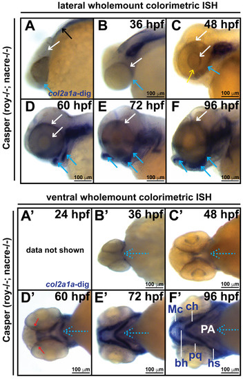 - Baas, D.; Malbouyres, M.; Haftek-Terreau, Z.; Le Guellec, D.; Ruggiero, F. Craniofacial cartilage morphogenesis requires zebrafish col11a1 activity. Matrix Biol. 2009, 28, 490–502. [Google Scholar] [CrossRef]