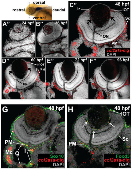 The congenital eye anomalies and facial defects observed in Stickler syndrome likely reflect an underlying disruption of the cranial neural crest. Col2a1a gene expression in the craniofacial cartilage, ear, notochord, floor plate, hypochord and fins of zebrafish has previously been shown [25,26]. Therefore, we first examined the patterning of col2a1a expression in and around the developing eye in WT Casper strain zebrafish embryos during development at 24, 36, 48, 60, 72 and 96 hpf. Microscopy analysis of wholemount and section colorimetric in situ hybridization showed that col2a1a expression initiates within the hindbrain and notochord at 24 hpf (black arrow, Figure 1A) and progresses dorsoposteriorally and ventrally into the ocular (white arrows, Figure 1A–F) and craniofacial regions (blue arrows, Figure 1A–F; blue dashed arrows, Figure 1B’–F’), respectively, with apparent expression in the anterior segment [iris (Ir) (Figure 1C”), hyaloid vasculature (black arrows, Figure 1C”), sclera (Sc) and periocular mesenchyme (PM) (Figure 1C”), ocular fissure (yellow arrow, Figure 1C), and optic nerve (red arrows, Figure 1D’; ON, Figure 1C”)] at 48 and 60 hpf (Figure 1D”). By 96 hpf, col2a1a-expressing neural crest cells were almost completely migrated from the ocular region and were primarily detected in the developing jaw and pharyngeal arches (Figure 1F”). Thus, in addition to its well-characterized craniofacial localization, col2a1a is also expressed in neural crest-derived structures of the anterior segment during early eye development. Studies in numerous animal models have demonstrated that the transcription factors Sox10 and Foxd3 are regulators of neural crest cell migration that demarcate temporally and spatially distinct neural crest cell populations in the periocular mesenchyme and within the eye [27,28,29,30,31]. To further characterize col2a1a expression in the cranial neural crest, we examined its expression in Tg(sox10::EGFP) and Tg(foxd3::EGFP) transgenic lines. Wholemount colorimetric in situ hybridization, followed by sectioning, immunostaining and fluorescence confocal microscopy revealed the colocalization of col2a1a expression with Foxd3-positive neural crest cells in the ocular anterior segment [hyaloid vasculature (arrows), iris outflow tract (IOT), sclera (Sc), and periocular mesenchyme (PM) (Figure 1H)] and Sox10-positive neural crest cells in the developing jaw [Meckel’s cartilage (Mc), trabeculae (T), and quadrate (Q)] and PM of zebrafish at 48 hpf (Figure 1G). Thus, Col2a1a is expressed in both ocular Foxd3-positive and craniofacial Sox10-positive neural crest cell populations during early development in zebrafish.