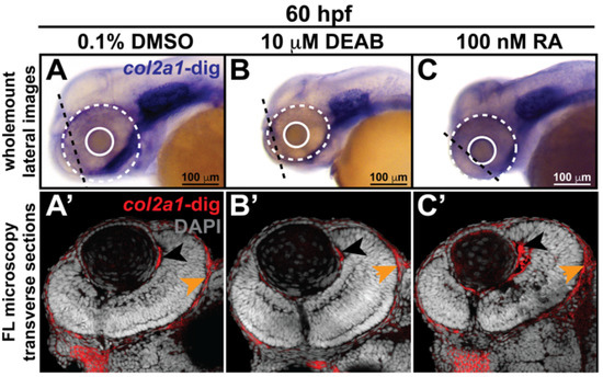 Retinoic acid regulates col2a1a expression in the ocular neural crest. Treatment with 10 mM DEAB, a selective pan-aldehyde dehydrogenase inhibitor, and 100 nM RA effectively decreased and increased, respectively, ocular col2a1a expression in WT Casper zebrafish embryos compared with their DMSO control-treated counterparts. Wholemount in situ analysis was performed using a chromogenic (blue) colorimetric assay (Vector Blue Substrate Kit, Vector Laboratories). Lateral images (A–C) at 60 hpf show the teratogenic effects of pharmacological insult on the ocular development of the treated embryos. The solid and dashed circles highlight the effect on eye size. The black dashed lines indicate the orientation of the plane of section, which passes perpendicular to the spinal column and extends in the rostral-caudal direction. FL microscopy analysis of transverse cephalic sections of the treated embryos at 60 hpf obtained after wholemount colorimetric in situ analysis developed using a fluorescent (Far Red/Cy5) substrate (Vector Blue Substrate Kit, Vector Laboratories) (A’–C’) show the effects of pharmacological insult on the anterior segment within the developing eye. The black arrowhead highlights col2a1a expression in the hyaloid vasculature and the orange arrowhead highlights col2a1a expression in the sclera/periocular mesenchyme. Quantification of these effects (D) shows that DEAB significantly decreased col2a1a expression, while RA significantly increased col2a1a expression. *, p-value ≤ 0.05. Ventral images (E,F,G) of wholemount in situ analysis at 90 hpf show the teratogenic effects of pharmacological insult on the ocular and craniofacial development of treated embryos. The solid and dashed circles highlight the effect on eye size. The white (Meckel’s cartilage development) and red (basihyal development) arrows highlight the effects on jaw development. The asterisks highlight the areas of pharyngeal arch development.