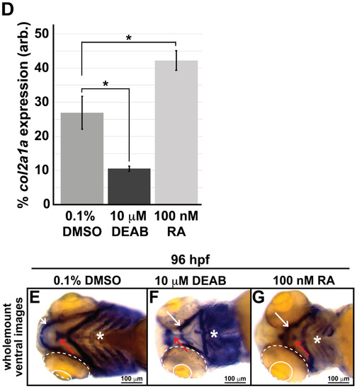 As an essential morphogen and major regulator of cranial neural crest cells during embryogenesis, the tight control of retinoic acid (RA) mediates the migration and differentiation of these cells within the pharyngeal arches, frontonasal process, and periocular mesenchyme, which ultimately give rise to cranial bones and connective tissues as well as the structures in the ocular anterior segment [32,33,34,35,36,37]. Accordingly, we next examined the influence of alterations in RA levels on col2a1a expression in the ocular and craniofacial neural crest. Fluorescence microscopy analysis of wholemount colorimetric in situ hybridization analyses following treatment at 24 hpf with 10 mM N,N-diethylaminobenzaldehyde (DEAB), a selective pan-aldehyde dehydrogenase inhibitor that decreases endogenous RALDH2/3-mediated RA synthesis [38,39,40], showed significantly decreased col2a1a expression in the anterior segment of WT Casper zebrafish embryos at 60 hpf (Figure 2B,B’,D) compared with their DMSO control-treated counterparts (Figure 2A,A’,D). In contrast, exogenous treatment with 100 nM RA at 27 hpf significantly increased col2a1a expression in these neural crest-derived structures at 60 hpf (Figure 2C,C’,D). Further examination of col2a1a expression in 60 and 96 hpf embryos treated with DEAB and RA, revealed that the teratogenicity of both exogenous treatments during ocular and craniofacial development was considerable, showing alterations in eye size (solid and dashed circles, Figure 2A–C,E–G) and marked jaw deformities (Figure 2E–G). Taken together, these results suggest that col2a1a is a downstream target of RA regulation in the cranial and ocular neural crest.