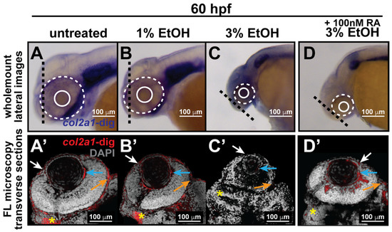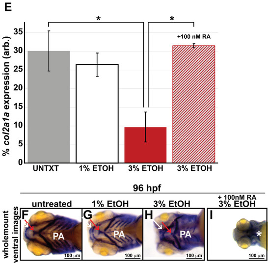 Indeed, studies in several models have previously shown that ethanol adversely affects the induction, expansion, migration, and differentiation of the cranial neural crest during development, and ETOH exposure increases the apoptosis of craniofacial neural crest cells [60,61,62,63,64]. Moreover, oxidative stress has previously been indicated as the mechanism underlying ETOH-induced apoptosis in the cranial neural crest [65,66,67,68]. Consistently, we also demonstrated that ETOH exposure increased oxidative stress in the cranial neural crest, however this effect was only observed in ventral neural crest cells that form the facial mesenchyme but not in those that contribute to the developing eye [28]. Notably, in this study, treatment with 3% ETOH starting at 24 hpf did significantly increase the percentage of apoptotic cells in the developing eye, but the cells undergoing apoptosis were primarily located in the retina and lens but not in the neural crest-derived ocular anterior segment [28]. Taken together, the results of these previous studies explain the apparent specificity of the RA-mediated rescue of col2a1a expression for the ocular neural crest and suggest that ethanol may directly affect col2a1a expression in ocular neural crest cells.