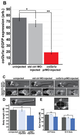 Col2a1a knockdown mimicked the characteristic features of human Stickler syndrome in zebrafish. A lissamine-tagged antisense MO targeting the promoter region (prMO) of col2a1a was injected into TgBAC(col2a1a::EGFP) and Tg(sox10::EGFP) embryos at the single-cell stage. Lateral FL microscopy images (A) show the loss of GFP reporter expression driven by the col2a1a promoter in TgBAC(col2a1a::EGFP) transgenic fish (lower right panel) compared with uninjected and standard control (std ctrl) MO-injected embryos (upper right and middle panels, respectively). Quantification of this effect showed a significant loss of expression (B). MO-injected Sox10-positive transgenic zebrafish embryos showed skeletal defects, including scoliosis (upper right panel, dashed black line, (C)) and significantly shortened body length (D), measured perpendicular to the spine from the tip of the epiphysis to the area above the urogenital opening (white dashed arrow (inset, D), delayed neural crest-derived jaw development (white arrowhead, upper right panel and black asterisk, lower right-most panel, (C)), and significantly smaller bulging eyes (solid and dashed circles, (C,E)), as measured along the anterior–posterior (a-p; inset, E) and dorsal-ventral (d-v; inset, E) axes, compared with uninjected and std ctrl MO-injected embryos at 48 and 72 hpf (left and middle panels, (C–E)). *, p-value ≤ 0.05; **, p-value ≤ 0.001.