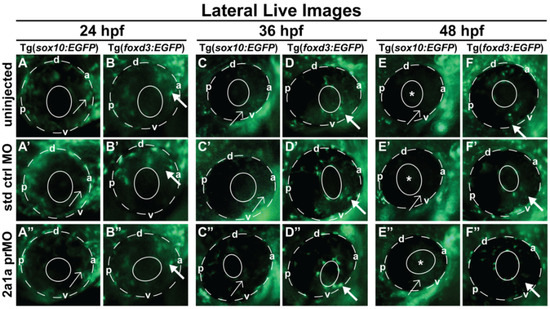 Col2a1a MO knockdown differentially affected Sox10 and Foxd3 expression and ocular neural crest cell migration during early eye development. Lateral live imaging at 24, 36 and 48 hpf showing the effects of Col2a1a knockdown on GFP reporter expression in Tg (foxd3::EGFP) and Tg(sox10::EGFP) transgenic zebrafish embryos injected at the single-cell stage with a lissamine-tagged antisense prMO targeting col2a1a. (A–F) uninjected, (A’–F’) standard control (std ctrl) MO-injected, (A”–F”) col2a1a promoter MO (prMO)-injected. Foxd3-positive cell migration (bold arrows, (F”)) was not affected after MO injection compared with that in std ctrl MO-injected (D”) and uninjected embryos (B”). Sox10-positive cell migration (E”) was markedly disrupted in response to Col2a1a MO knockdown, as these cells were retained in the anterior segment (asterisk) and periocular mesenchyme (single arrows) in contrast to the cells in their uninjected (F) and std ctrl-injected counterparts (F’), which showed few Sox10-positive cells in the anterior segment at 48 hpf. The solid and dashed circles highlight the lens and retinal piment epithelium, respectively, in the zebrafish eyes. d, dorsal; v, ventral; p, posterior; a, anterior.