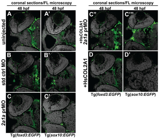 Further analysis of the zebrafish Col2a1a knockdown Stickler syndrome model was conducted to determine the role of Col2a1a in embryonic ocular development, specifically focusing on the neural crest-derived anterior segment. For these experiments, we examined the effects of Col2a1a MO knockdown in both Tg(foxd3::EGFP) and Tg(sox10::EGFP) zebrafish lines. Lateral live imaging showed that despite the observed ocular defects, Col2a1a knockdown did not affect Foxd3-positive cell migration into the anterior segment between 36 and 48 hpf (bold arrows, Figure 5D”,F”) compared with that in standard control MO-injected (Figure 5D’,F’) and uninjected (Figure 5D,F) embryos. However, Sox10-positive cell migration was markedly disrupted in response to Col2a1a MO knockdown, as these cells were retained in the anterior segment (asterisks, Figure 5E,E’,E”) and periocular mesenchyme (single arrows, Figure 5E,E’,E”) in contrast to their uninjected and control-injected counterparts, which showed little to no Sox10-positive cells in the anterior segment at 48 hpf. Marked differences between Foxd3 and Sox10 expression in response to Col2a1a knockdown were detected in transverse cephalic sections of MO-injected zebrafish embryos at 48 hpf. MO knockdown of Col2a1a decreased the expression of Sox10 in the ocular anterior segment neural crest, while the expression of Foxd3 in the Foxd3-positive ocular neural crest cell remained unaffected (Figure 6C,C’). Interestingly, coinjection of human COL2A1 protein rescued the effects of the MO knockdown on Sox10 expression (Figure 6C’’’), suggesting evolutionarily and functionally conserved roles between human COL2A1 and zebrafish Col2a1a genes. Notably, the injection of human COL2A1 alone significantly decreased Sox10 expression in ocular and craniofacial neural crest cells (Figure 6D’). Taken together, these results suggest that Col2a1a is necessary for the maintenance of ocular and craniofacial Sox10 expression and the promotion of Sox10-positive neural crest cell migration during early eye development.