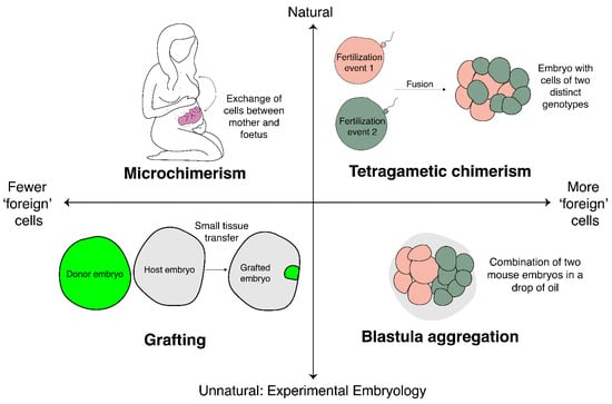 A spectrum of chimeras. This diagram conceptualises examples of chimeras discussed across two axes: degree of naturality (i.e., naturally occurring or produced by experimental manipulation), and the proportion of foreign cells relative to total cell number. Naturally occurring chimeras include microchimeras (top left) and tetragametic chimeras (top right). Experimentally produced chimeras include grafted embryos (bottom left) and blastula aggregation experiments (bottom right). See text for details.