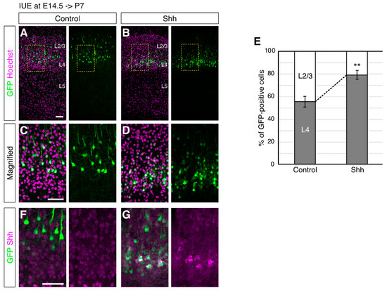 Shh overexpression at E14.5 increases the percentage of neurons in L4 at P7. (A,B). Empty (Control, (A)) or Shh expression vector (Shh, (B)) together with a GFP vector was electroporated into E14.5 brains, and then P7 brains were analyzed. The sections were counterstained with Hoechst (magenta). The boxed regions are shown at higher magnification in (C,D). (E). The percentages of the cells in L2/3 and L4 were determined in each condition. Quantitative data are presented (n = 3 for each group). ** p < 0.01. Note that the GFP-positive cells with Shh expression vector are located more in L4 than the control cells. (F,G). Expression of Shh was shown in the neurons treated as in (A,B). (Scale bars: 200 µm in (A,C,F)).