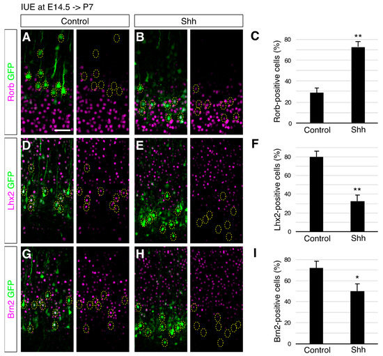 Shh-overexpressing cells at E14.5 acquire L4 characteristics. Empty (Control) or Shh expression vector (Shh) together with a GFP vector was electroporated into E14.5 brains, and then P7 brains were analyzed. The sections were immunostained for Rorb (A,B), Lhx2 (D,E), and Brn2 (G,H). The results of quantitative analysis for Rorb (C), Lhx2 (F), and Brn2 (I) are presented (n = 3 for each group). ** p < 0.01, * p < 0.05. Note that Shh-overexpressing cells acquired expression of Rorb, but lost expression of Lhx2 and Brn2. (Scale bar: 200 µm in (A)).