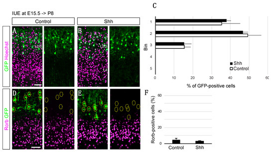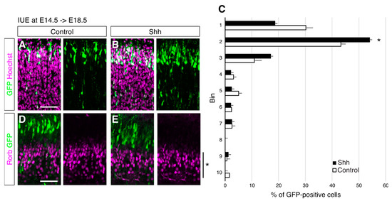 Upregulated Shh signaling regulates cell positioning without affecting an L4 marker expression. Empty (Control) or Shh expression vector (Shh) together with a GFP vector was electroporated into E14.5 brains, and then E18.5 brains were analyzed. The sections were counterstained with Hoechst (A,B) or immunostained for Rorb (D,E). The asterisk shows expression of Rorb in developing L5 neurons [16]. (C). Quantitative data of cell positioning are presented. The position of each GFP-positive cell relative to the total distance from the bottom of the subplate to the outer edge of the cortical plate was measured, followed by sorting into 10 bins (n = 4 for each group). * p < 0.05. (Scale bars: 200 µm in (A,D)).