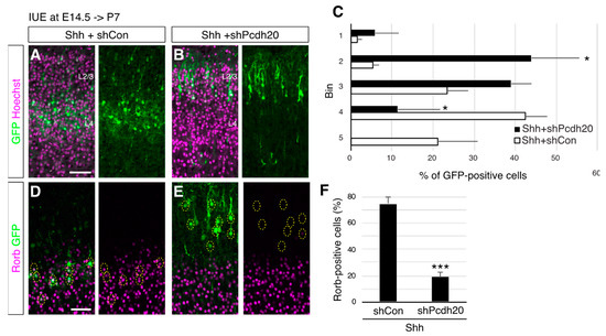 Shh overexpression promotes L4 fate acquisition in a cell positioning-dependent manner. Shh expression vector together with a control shRNA (Shh+shCon) or Pcdh20 shRNA vector (Shh+shPcdh20) was electroporated into E14.5 brains, and then P7 brains were analyzed. The sections were counterstained with Hoechst (A,B) or immunostained for Rorb (D,E). (C). Quantitative data of cell positioning are presented. The position of each GFP-positive cell relative to the total distance from the bottom of L4 to the outer edge of the cortical plate was measured, followed by sorting into 5 bins in each condition (n = 4 for each group). (F). The result of quantitative analysis for Rorb is presented (n = 4 for each group). * p < 0.05, *** p < 0.001. (Scale bars: 200 µm in (A,D)).