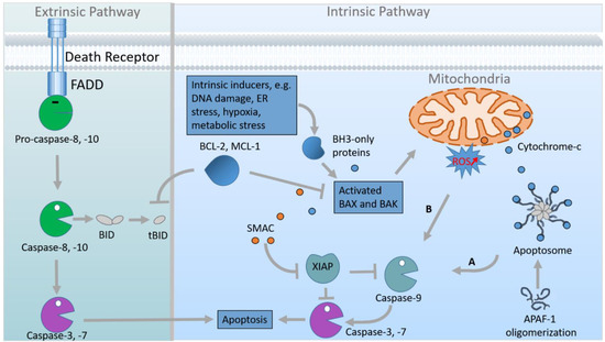 The intrinsic pathway is stimulated when the cell is exposed to stress stimuli (e.g., lack of growth factors, metabolic stress, loss of adhesion, etc.). It starts with the inhibition of anti-apoptotic members of the B-Cell Lymphoma 2 (BCL-2) protein family [such as BCL-2, Myeloid Cell Leukemia 1 (MCL-1), etc.] by pro-apoptotic members of the same protein family [for example, the BH3 (BCL-2 Homology Domain 3)-only proteins BCL-2-Interacting Mediator of Cell Death (BIM), P53 Upregulated Modulator of Apoptosis (PUMA), BH3-Interacting Domain Death Agonist (BID), BCL-2-Antagonist of Cell Death (BAD), etc.]. This inhibition results in the activation of BCL-2-Associated X Protein (BAX) and BCL-2 Homologous Antagonist/Killer (BAK). Activated BAX and BAK permeabilise the mitochondrial outer membrane leading to the release of Cytochrome-c and further apoptogenic factors from the mitochondria into the cytoplasm. In the cytoplasm, Cytochrome-c, Apoptotic Peptidase Activating Factor 1 (APAF-1) and Caspase-9 (CASP9) form the apoptosome. This formation engenders the activation of CASP9 which subsequently cleaves and, hence, activates the effector caspases CASP3, CASP6, and CASP7 [35,36,37,38,39]. A second CASP9 activation pathway functions independent of the apoptosome and is triggered by increasing ROS concentrations [40].