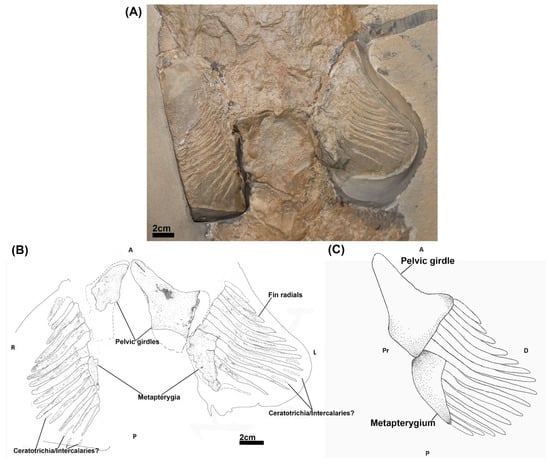 NHMUK PV P 9269 (Figure 1A,B) has two mesially situated pelvic girdles, the left girdle being better preserved. The girdles have an elongated triangular shape with the longest process of each being situated anteriorly. Whilst these processes are oriented towards each other proximally, they lack a symphysis. Posterior to the left girdle is a subtriangular metapterygial element which tapers off posteriorly. A less well preserved metapterygium is preserved posterior to the right girdle. Perpendicular to the distal sides of each girdle and metapterygium is a series of fin radials, which exhibit a centripetal variation in length and breadth, being longer and thicker in the centre of the fins and shorter towards the anterior and posterior extents of the fins. Different numbers of radials are preserved in each fin, 15 in the right and 12 in the left. The eight most anterior radials of each fin are in close proximity with the pelvic girdle, with the remaining radials articulating directly on each metapterygial element or being in close proximity to them. Due to some poor preservation and damage to the specimen, the full extent of the pelvic girdles and their relationship with the fin radials and metapterygia is not certain (Figure 1A). Thin skeletal elements of uncertain identity are located between some of the posterior fin radials, potentially representing ceratotrichia [33] or intercalary radials [32,48].
