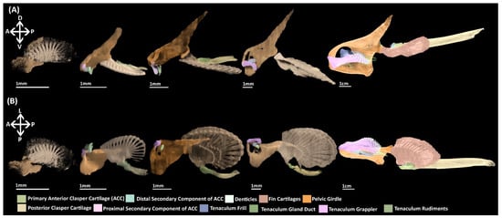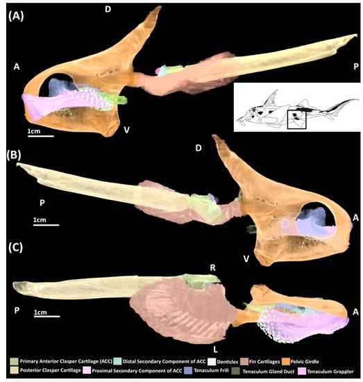 The pelvic and reproductive skeleton now bear the closest resemblance to that of the adult (Figure 8). The pelvic girdle and fin skeleton are essentially the same as that of the adult in miniature. The primary anterior clasper cartilage also more closely resembles the adult with its grooves and features being more well defined compared to stage 34 (Figure 7A,B), but the secondary components of this structure have still not formed. The posterior clasper cartilage has extended further posteriorly and taken on a well-defined scroll like morphology akin to that of the adult. The components of the pre-pelvic tenacula, the grappler, frill, and gland duct (sensu [47]) are now clearly identifiable, but these are much smaller proportionally compared to that of the adult (Figure 2).