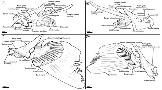 - Gegenbaur, C. Ueber Die Modificationen Des Skeletts Der Hintergliedmassen Bei Den Mannchen Der Selachier Und Chimaren. Jena. Z. Naturw 1870, 5, 448. [Google Scholar]