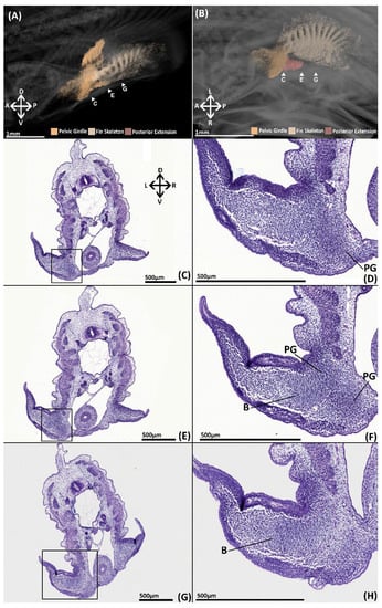 NanoCT models (A,B) and transverse paraffin sections (C–H) of a male stage 30 elephant shark (Callorhinchus milii) embryos. Sections are stained with haematoxylin, eosin and alcian blue and presented in an anteroposterior order. (A) 3D models of the pelvic skeleton of C. milli from a distal lateral view showing the span of the pelvic girdle; (B) same models from a ventral view showing the rays forming the basipterygium and the articulation of the fin skeleton on the pelvic girdle; (C) trunk section showing early mesenchymal condensation of the pelvic girdle; (D) close up of C within the black box; (E) trunk section showing the early mesenchymal pelvic and basipterygium; (F) close up of E within the black box; (G) trunk section showing extent of the mesenchymal basipterygium within the pelvic fin; (H) close up of G within the black box. B-basipterygium PG-pelvic girdle. Anatomical orientation of models indicated by A-anterior D-dorsal P-posterior R-right L-left V-ventral.