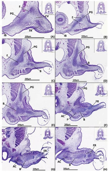 Close ups of transverse paraffin sections of a male stage 31 elephant shark (Callorhinchus milii) embryo stained with haematoxylin, eosin and alcian blue, presented in an anteroposterior order. The position of each close up is indicated by black boxes in the inset images. (A) close up of trunk section showing the anterior process of the mesenchymal pelvic girdle, the central vacuity and the tenacula rudiments; (B) close up of trunk section showing the posterior region of the anterior process and the first foramina anterior of the iliac process; (C) close up of trunk section showing the beginning of the mesenchymal iliac process and anterior region of basipterygium; (D) close up of trunk section showing the connection mesenchymal pelvic girdle and basipterygium; (E) close up of trunk section showing the mesenchymal basipterygium and dorsal regions of the mesenchymal iliac process; (F) close up of trunk section showing the connection of the mesenchymal basipterygium with a fin radial and the mesenchymal anterior clasper cartilage; (G) close up of trunk section showing the connection of the mesenchymal basipterygium and anterior clasper cartilage; (H) close up of trunk section showing the connection between the posterior regions of the basipterygium and the anterior clasper cartilage.AC-anterior clasper cartilage B-basipterygium CV-central vacuity F-foramina FR-fin radial IB-inter-pelvic band PC-posterior clasper cartilage PG-pelvic girdle. Anatomical orientation of models indicated by A-anterior D-dorsal P-posterior R-right L-left V-ventral.