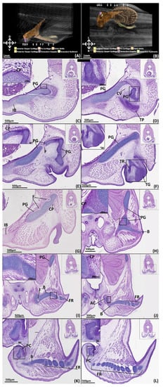 NanoCT models (A,B) and transverse paraffin sections (C–L) of a male stage 34 elephant shark (Callorhinchus milii) embryo. Transverse paraffin sections are stained with haematoxylin, eosin and alcian blue and presented in an anteroposterior order. The position of each close up is indicated by black boxes in the inset images. (A) models of the pelvic skeleton of C. milli from a distal lateral view; (B) models from a dorsal view; (C) close up of a trunk section showing the anterior region of the pelvic girdle; (D–E) close up of a trunk section showing the anterior process of the pelvic girdle and the condensing of the cartilages framing the central vacuity; (F) close up of a trunk section showing the anterior process and the condensing tenaculum grappler; (G) close up of a trunk section showing the lower dorsal region of the pelvic girdle; (H) close up of a trunk section showing the point of articulation between the pelvic girdle and the basipterygium; (I) close up of a trunk section showing the dorsal region of the pelvic girdle and the basipterygium and its connection with some fin radials; (J) close up of a trunk section showing the articulation between the chondrogenic anterior clasper cartilage and the basipterygium; (K) close up of a trunk section showing the anterior region of the posterior clasper cartilage and posterior regions of the basipterygium; (L) close up of a trunk section showing posterior regions of the posterior clasper cartilage and fin radials. AC-anterior clasper cartilage B-basipterygium CP-perichondrium CV-central vacuity F-foramina FR-fin radial(s) PC-posterior clasper cartilage PG-pelvic girdle TG-tenaculum grappler TR-tenacula rudiments. Anatomical orientation of models indicated by A-anterior D-dorsal P-posterior R-right L-left V-ventral.