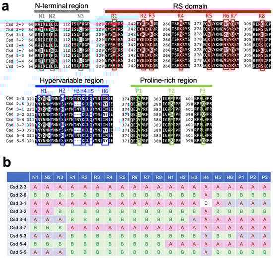 Variations in the amino acid sequences encoded by csd alleles identified in this study. (a) Alignment of the amino acid sequences in regions with interallelic polymorphisms among the alleles. Both the N-terminal region and proline-rich regions contain three amino acid substitutions (N1–N3 and P1–P3). Seven amino acid substitutions (R1–R5, R7, and R8) and a substitution of two consecutive amino acid residues (R6) were found within the RS domain. Various mutations were observed within the hypervariable region (R1–R8). (b) Classification of alleles based on the polymorphisms in their amino acid sequences. The mutations observed at the indicated positions (N1–N3, R1–R8, H1–H6, and P1–P3) in csd2-3 and csd2-6 were defined as types A and B, respectively. Polymorphisms that did not belong to either type A or B are classified as type C.