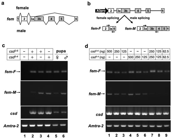 fem pre-mRNA exhibits sex-associated differences in splicing between exons 3 and 6. Female-specific fem splicing occurs between the splice donor site, located in the middle of exon 3, and the 5′ splice acceptor site of exon 6 (Figure 2a) []. To test whether our in vitro splicing assay system can reproduce the sex-specific splicing of fem pre-mRNA, the splicing pattern of the fem minigene was investigated by RT-PCR in the presence or absence of the Csd protein. For this purpose, the fem minigene, which contains genomic DNA encompassing exons 2 to 6 of fem (Figure 2b), was co-transfected with an expression vector encoding the Csd protein and the Am-Tra2 expression vector into BmN cells. The csd alleles used in these experiments were csd2-6 and csd5-4.