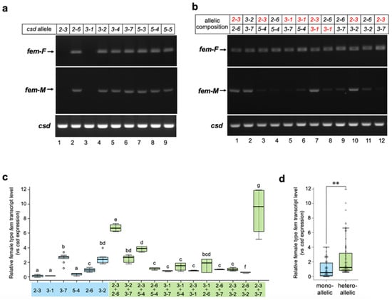 Splicing patterns of the fem minigene under single-allele and heteroallelic conditions. (a) All csd alleles acquired in this study were subjected to the analysis described in Figure 2. (b) Two different csd alleles in the indicated combinations were transfected into BmN cells with the fem minigene to recreate a heteroallelic condition. RT-PCR analysis was performed as described in Figure 2. The csd alleles lacking fem pre-mRNA splicing activity are shown in red. (c) The level of female-type fem transcript produced from the fem minigene relative to the csd expression level was compared between the monoallelic and heteroallelic conditions using qRT-PCR (Materials and Methods). The values obtained from each sample, and their distributions, are represented by box-and-whisker plots. Error bars are standard deviation. Different letters indicate statistically significant group differences (i.e., “a” is significantly different from “b” and “c”, etc.). “bd” means significantly different from groups other than b and d (i.e., not significantly different from groups b and d), and “bcd” means significantly different from groups other than b, c, and d (in other words, not significantly different from groups b, c, and d). There were six qPCR runs per experimental group; the Kruskal–Wallis test was followed by the Dunn–Bonferroni post hoc test, p < 0.001. (d) All single-allele and heteroallelic values indicated in (c) were integrated and statistically compared between the two groups. The values obtained for each sample, and their distributions, are represented by box-and-whisker plots. Error bars are standard deviation. ** p < 0.01 (Mann–Whitney U test).