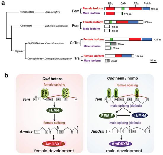 To molecularly characterize the function of Csd, which is responsible for CSD in honeybees, we developed an in vitro assay system to evaluate the splicing activity of Csd proteins (Figure 2). In the present study, we used this system and found that csd expression in the monoallelic condition was capable of inducing the female mode of fem splicing (Figure 2 and Figure 3). The efficiency of female-mode fem splicing was similar between single-allele and heteroallelic conditions (Figure 3c). Interactions between Csd protein and fem pre-mRNA were observed regardless of whether the Csd expression was monoallelic or heteroallelic (Figure 3c). The most striking difference between monoallelic and heteroallelic Csd expression was the occurrence (or not) of the male mode of fem splicing (Figure 3a,b). The male mode of fem splicing was generally observed only under monoallelic conditions (Figure 3a). Consistent with our findings, RT-PCR analysis in a previous report indicated the presence of both fem-F and fem-M transcripts in haploid male embryos []. These findings are in contrast to a previous report that Csd proteins are activated only when csd occurs in the heteroallelic composition, leading to female development via the induction of female-mode fem splicing [,]. One possible explanation for this discrepancy is that the male form of the Fem protein may play a role in promoting male development. Alternatively, the male-specific isoform of Fem may act as a dominant negative regulator of the female Fem isoform, which is required for femaleness, thus leading to male development. fem has been identified as a tra ortholog in A. mellifera []. The splicing patterns of tra transcripts characterized to date in holometabolous insects indicate sexual dimorphism, with only the female-specific splicing variant encoding a functional protein, while the male-specific splicing variant yields truncated or nonfunctional protein products lacking significant domains [] (Figure 5a). The male-mode fem transcript produces a truncated version of Fem in A. mellifera due to the inclusion of exons containing an intervening stop codon []. However, in contrast to the male Tra proteins in other holometabolous insects, the male isoform of Fem in A. mellifera contains an RS domain, which mediates protein–protein interactions and regulates the recognition of specific splice sites [] (Figure 5a). Thus, the male isoform of Fem may have some function in male development in the honeybee. This hypothesis is supported by the previous finding that Am-Tra2 plays a positive role in inducing the male mode of fem splicing [].