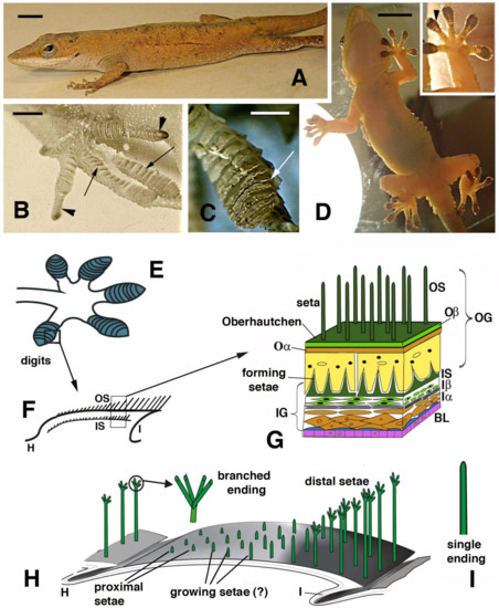 - Alibardi, L. Morphogenesis of digital pad lamellae in the embryo of the lizard Anolis lineatopus. J. Zool. 1997, 243, 47–55. [Google Scholar] [CrossRef]
