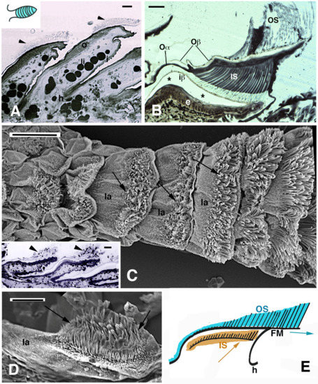 Histology (A,B) and SEM view (C–E) of digital lamellae in geckos. (A), longitudinal section of Phelsuma dubia showing a group of setae at the tip of the lamellae (arrowheads). Bar, 20 μm. (B), pad lamella of Hemidactylus turcicus featuring the outer and inner setae generations. Asterisks indicate an artifact detachment of the inner Oberhautchen-beta-layer from the epidermis. Bar, 20 μm. (C), SEM view of the ventral side of a digit in Tarentola mauritanica. Note the apical localization of the setae (arrows) in the lamellae. The longer setae are located in the distal lamellae. Bar, 200 μm. In the inset (Bar, 20 μm), the apical localization of setae (arrowheads) is evident in Anolis carolinensis lamellae. (D), apical collection of setae (arrows) in an isolated pad lamella of H. turcicus otherwise covered with spinulae. Bar, 50 μm. (E), schematic drawing of lamella with outer and inner generation of setae. The arrows indicate the presumed direction of shifting of the outer and inner setae. Legend: e, epidermis; FM, free margin (apical part of the Oberhautchen-beta-layer sustaining the apical outer setae); h, hinge (inter-scale/lamella) region; i, inner lamella surface; iβ, inner Oberhautchen-beta-layer; IS, inner setae generations; la, pad lamella; li, lipid droplets (cells); o, outer lamella surface; Oα, outer alpha-layer; Oβ, outer Oberhautchen-beta-layer; OS, outer setae generation.